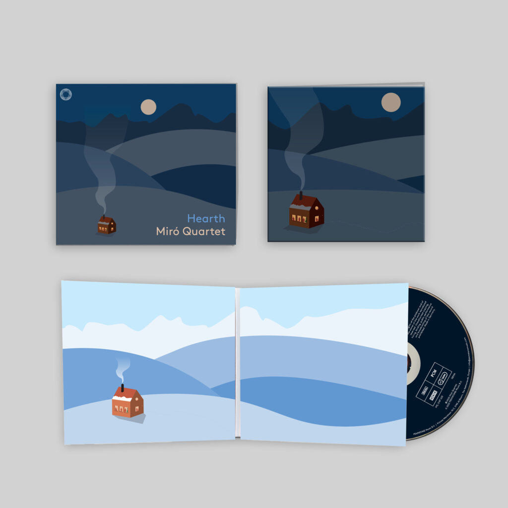 I designed the artwork for Hearth by illustrating a solitary house nestled in a quiet winter landscape, surrounded by soft, snowy hills. I added an easter egg to this design: when you look closely, you can spot the members of the quartet gathered inside the warm glow of the house. I first created a daylight version of the scene, but it wasn’t until I made a night variation (with the moon hanging above the hills) that my colleagues said: “This is exactly what I imagine when I think of the album Hearth!”